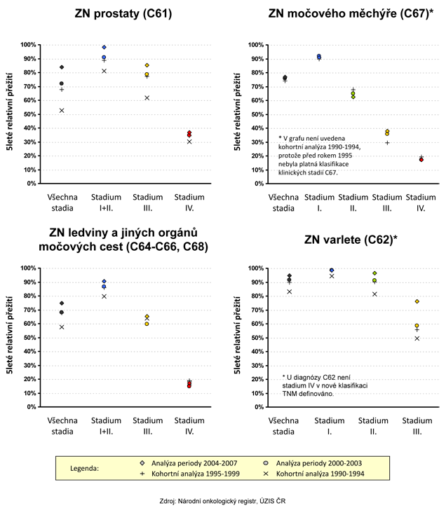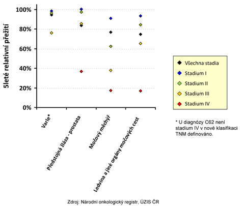 - Celkové hodnoty 5letého přežití, prezentované bez dělení na klinická stadia, nelze mezi jednotlivými diagnózami jednoduše srovnávat, neboť jsou značně ovlivněny zastoupením klinických stadií. Příkladem je karcinom močového měchýře (C67) a karcinom prostaty (C61), které dosahují podobných hodnot 5letého relativního přežití. Tuto podobnost vysvětluje tabulka 3 a obrázek 2, které ukazují, že v případě karcinomu prostaty je v porovnání s karcinomem močového měchýře výrazně lepší přežití u všech klinických stadií, jsou-li stadia hodnocena odděleně. Podobnost celkového 5letého relativního přežití u obou diagnóz způsobilo vyšší procentuální zastoupení stadií III a IV u karcinomu prostaty (viz tabulka 1).